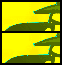 Der Haken am "Shape-Tweening": offensichtlich protokolliert Flash die Eckpunkte einer Form nicht so wie es sein soll und ist deswegen nicht in der Lage ihre korrekte Position in den Zwischenphasen zu berechnen. Gestern ist mir ein ganz abstruses Beispiel begegnet. Im Rahmen einer Animation habe ich eine Zeichnung angelegt. Die Outline dieser Zeichnung (also hier die dicke moosgrüne Kante) ist in einer Extra-Ebene angelegt. Wenn ich nun in dieser Outline ein neues Keyframe einfüge, bekommt die Outline plötzlich überall neue Punkte eingefügt. Kein Wunder daß das Shape-Tweening für die Grütze ist. Wenn sich im Zielbild doppelt soviele Punkte wie im Startbild befindet, kann Flash nicht die Start- und Zielposition der Punkte kennen.