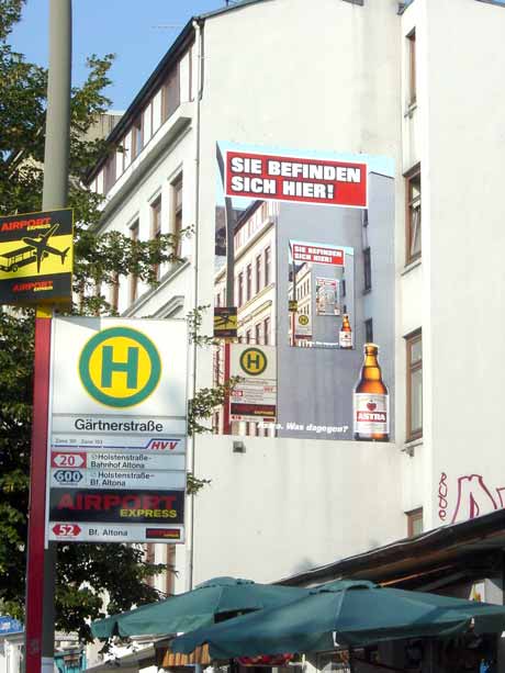 [10h47] Ein weiteres gelungenes Werbeplakat: das ASTRA-Plakat an der Bushaltestelle "Gärtnerstraße". Früher soll sich, laut Bart, dort ein Plakat für das Fitness-Center "Kaifu-Lodge" befunden haben, mit einer Wegbeschreibung ("dritte Ampel links" oder so). Das macht natürlich den ASTRA-Spruch noch mehr zu einem Insider.