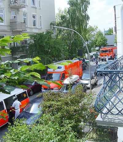 Inzwischen sind in die 100m lange Straße zirka 27 Löschzüge reingefahren. Deuerwehrwagen mit Drehleiter, diverse Löschfahrzeuge, Zillionen Rettungswagen und diverse Peterwagen.